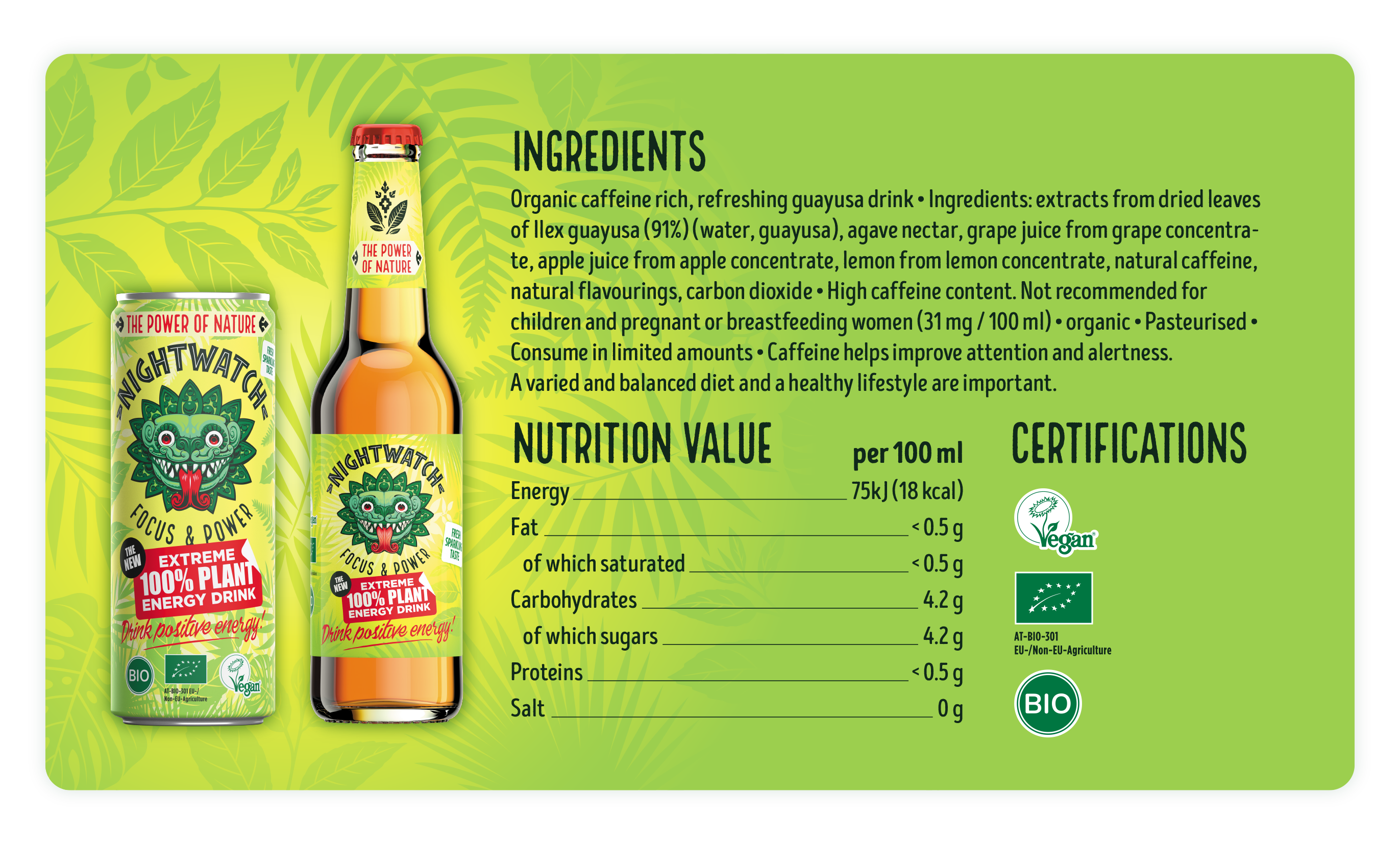 Nightwatch contains only 100% plant based energy, straight from the guayusa plant. Drinking Nightwatch gives you extreme energy for focus and power!