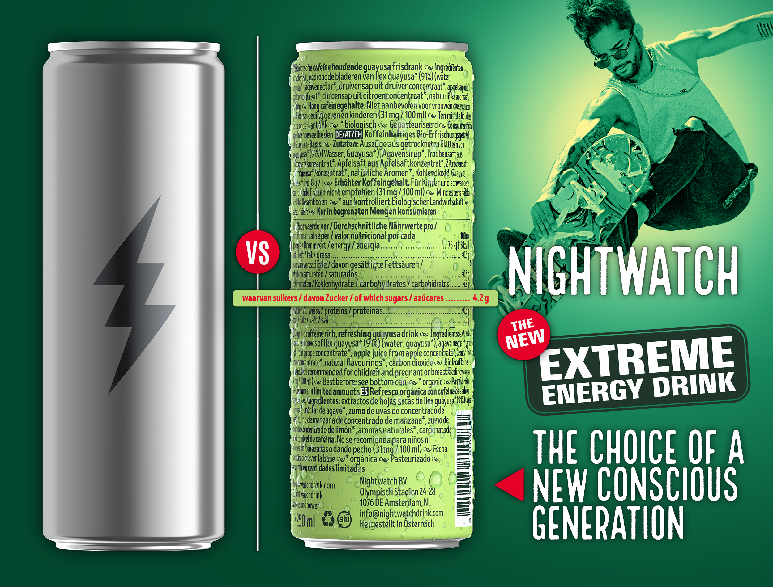 At Nightwatch, we believe that an energy drink should cause mainly positive effects. Sugar boosts for a short time, but disappoints in the longer term. After athe quick ‘rush’, the ‘crash’ can kick in, and your energy levels drop. That’s why our Extreme Energy drink consists of 100% plant-based extreme energy with a sugar level beneath the 5% norm. Short termed, you will feel long lasting energy. Without the downside of a sugar or caffeine 'crash' afterwards.