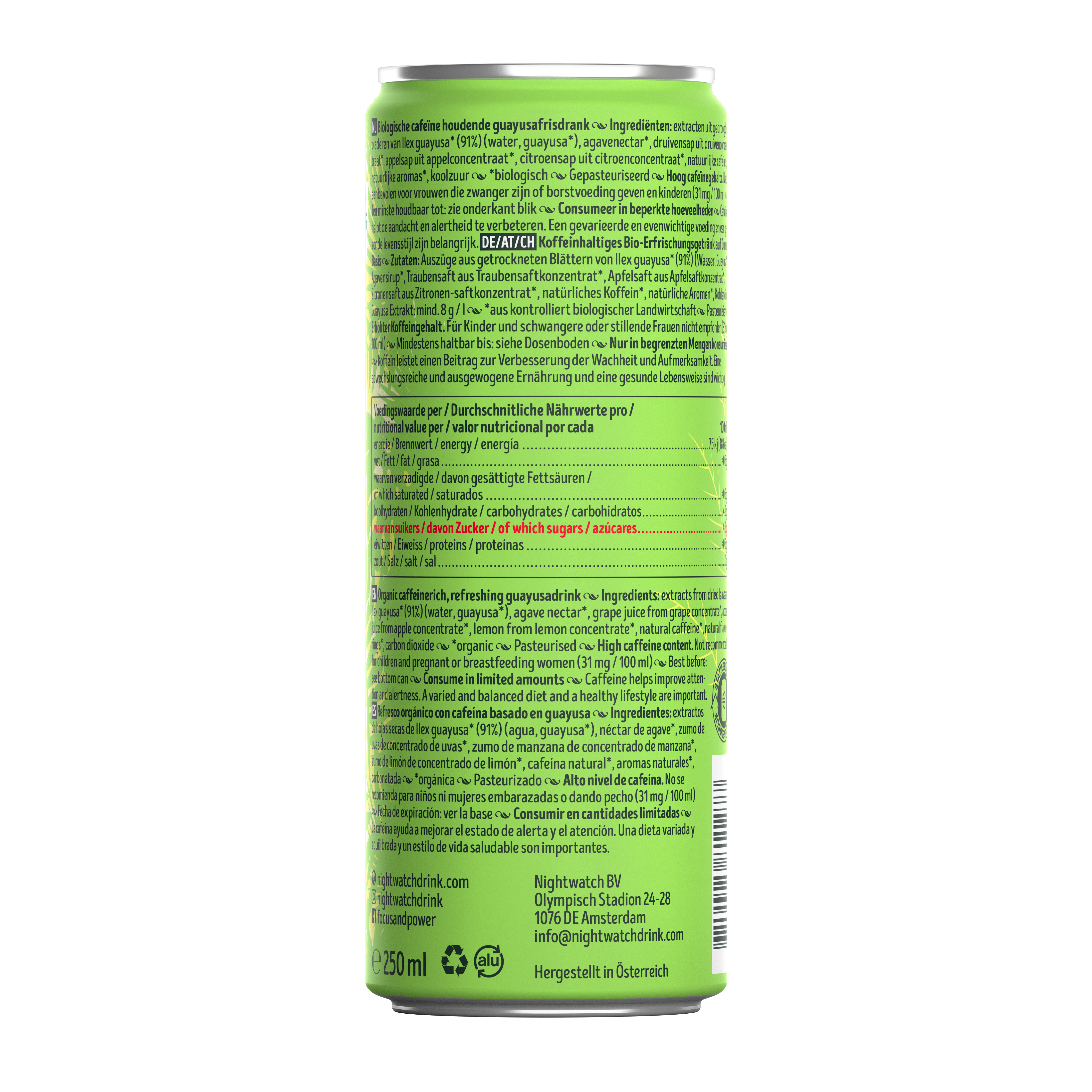 Nightwatch Can Nightwatch contains only 100% plant based energy, straight from the guayusa plant. Drinking Nightwatch gives you extreme energy for focus and power! 100% plant energy Buy now Our products Nightwatch Bottle Nightwatch will maintain sugar, or more precisely total carbohydrate content, below 4,3 grams per 100 ml. Nightwatch is only sweetened with fruit juices! Less sugar Buy now Our products Nightwatch branded fridge Nightwatch is only flavoured by fruit and flower extracts; in other words, less sugar and 100% plant based. Get used to less sugar! It is better for your health. Pure energy Buy now Our products
