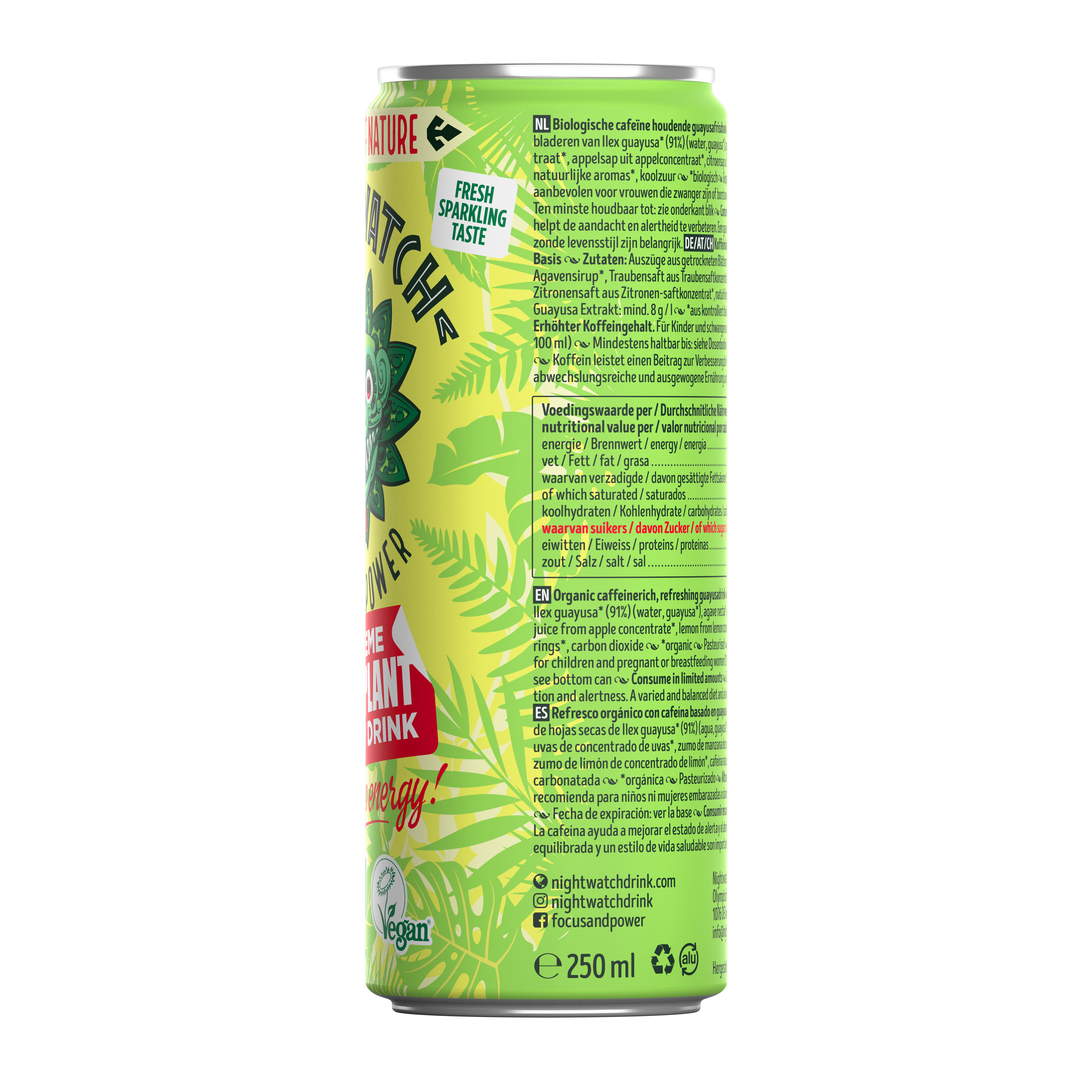• Sugar-free energy drink: Prioritize your health with Nightwatch, which contains no added sugars or artificial sweeteners. Each 250ml can offers just 4.2 grams of carbohydrates per 100ml.